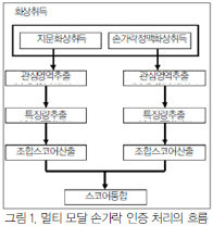¿©±â¿¡¼ Á¦¾ÈÇÏ´Â ¹æ½Ä¿¡¼´Â Áö¹®°ú Á¤¸ÆÀÇ 2°³ÀÇ ½ÅüÀû Ư¡À» µ¿½Ã¿¡ ÃëµæÇϰí, °¢ È»óÀÇ Á¶ÇÕ°á°ú¸¦ ÅëÇÕÇÏ¿© ÀÎÁõÀ» ÇàÇÑ´Ù. ±×¸² 1¿¡¼ ¸ÖƼ ¸ð´Þ ¼Õ°¡¶ô ÀÎÁõÀÇ Ã³¸®ÀÇ È帧À» ³ªÅ¸³½´Ù. ¿ì¼±, ¼¾¼¿¡¼ Áö¹®°ú Á¤¸ÆÀÇ È»óÀ» µ¿½Ã¿¡ ÃëµæÇϰí, ´ÙÀ½À¸·Î °¢ È»ó Áß¿¡¼ Á¶ÇÕ¿¡ ÀÌ¿ëÇÒ ÆÐÅÏÀÌ Á¸ÀçÇÏ´Â ¿µ¿ª(°ü½É¿µ¿ª)À» ÃßÃâÇÑ´Ù. Áö¹®À̳ª Á¤¸Æ°úÀÇ °¢ °ü½É¿µ¿ª¿¡¼ Ư¡·®À» ÃßÃâÇÏ¿©, °³º°·Î Á¶ÇÕ󸮸¦ ½Ç½ÃÇÑ´Ù. ±×¸®°í Áö¹®Á¶ÇÕ°ú Á¤¸ÆÁ¶ÇÕÀÇ ½ºÄھ ÅëÇÕÇϰí, ¸ÖƼ ¸ð´Þ ¼Õ°¡¶ô ÀÎÁõÀÇ Á¶ÇÕ½ºÄھ »êÃâÇÑ´Ù. ÀÌÈÄ¿¡¼´Â °¢°¢ÀÇ Ã³¸®°úÁ¤À» ¼³¸íÇÑ´Ù.