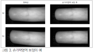 ±¸Ã¼ÀûÀ¸·Î´Â ¿ì¼± ȼÒÄ¡ÀÇ È÷½ºÅä±×·¥¿¡¼ ¿ªÄ¡¸¦ ±¸ÇØ È»óÀ» ÀÌÄ¡ÈÇϰí, ¼Õ°¡¶ô¿µ¿ªÀ» ±¸ÇÑ´Ù. ´ÙÀ½À¸·Î ¼Õ°¡¶ô¿µ¿ª¿¡¼ ´ÜÃà¹æÇâÀÇ ¶óÀθ¶´Ù ¼Õ°¡¶ô¿µ¿ªÀÇ Áß½ÉÁ¡À» ±¸ÇÏ¿© ÀÌ Á¡·ÄÀ» ¼Õ°¡¶ô¿µ¿ªÀÇ Á߽ɼ±À¸·Î½á ±¸ÇÑ´Ù. ±×¸®°í È»ó Àüü¿¡¼ ¼Õ°¡¶ô¿µ¿ªÀÇ Á߽ɼ±ÀÌ ¼Õ°¡¶ô ÀåÃà¹æÇâÀ¸·Î Á÷¼±ÀÌ µÇµµ·Ï ¼Õ°¡¶ô¿µ¿ªÀ» º¸Á¤ÇÑ´Ù. ±×¸² 3¿¡ ¼Õ°¡¶ô¿µ¿ª º¸Á¤ÀÇ ¿¹¸¦ ³ªÅ¸³½´Ù. ±×¸² 3(a)¿Í ±×¸² 3(b)ÀÇ ¿øÈ»óÀº °°Àº ¼Õ°¡¶ôÀ» ÃÔ¿µÇÑ °ÍÀÌÁö¸¸, ¾à°£ÀÇ À§Ä¡ ¾î±ß³²À̳ª ȸÀüÀÌ ¹ß»ýÇϰí ÀÖ´Ù. ¾Õ¿¡¼ ±â¼úÇÑ ¼Õ°¡¶ô¿µ¿ª º¸Á¤À» ÇàÇÔÀ¸·Î½á, ±×¸²¿¡ ³ªÅ¸³½ ¼Õ°¡¶ô¿µ¿ª º¸Á¤ ÈÄÀÇ È»ó°ú °°ÀÌ ¼Õ°¡¶ôÀÇ À§Ä¡ ¾î±ß³²À̳ª ȸÀüÀ» º¸Á¤ÇÒ ¼ö ÀÖ´Ù.