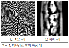 ÀÌ¿Í °°ÀÌ ÃßÃâÇÑ Áö¹® ¹× Á¤¸ÆÀÇ °ü½É¿µ¿ªÀÇ È»ó¿¡ ´ëÇØ¼ °¢°¢ÀÇ ÆÐÅÏÀ» °Á¶ÇÏ¿© È»óÀ» Á¤±ÔÈÇϴ ó¸®¸¦ ½ÃÇàÇÑ´Ù. ÆÐÅϰÁ¶ ó¸® ÈÄÀÇ Áö¹®°ú Á¤¸Æ °¢°¢ÀÇ °ü½É¿µ¿ªÀÇ È»óÀÇ ¿¹¸¦ ±×¸² 4¿¡ ³ªÅ¸³½´Ù.