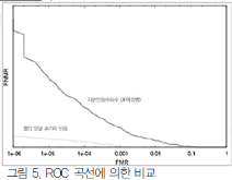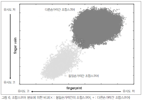 ±×¸² 5¿¡ Áö¹®Á¶ÇÕ°ú Áö¹®°ú Á¤¸ÆÀÇ ¸ÖƼ ¸ð´Þ ¼Õ°¡¶ô ÀÎÁõÀÇ ROC°î¼±À» Ç¥½ÃÇÑ´Ù. ±×¸² 5ÀÇ ROC°î¼±Àº, ¼¼·ÎÃàÀÌ FNMR(False Non-Match Rate, ¿ÀºñÇÕÄ¡À²), °¡·ÎÃàÀÌ FMR(False Match Rate, ¿ÀÇÕÄ¡À²)À̸ç, ¾î´À ¿ªÄ¡¿¡ ÀÇÇØ ÆÇÁ¤ÇÑ °æ¿ìÀÇ FMR°ú FNMRÀÇ Æ®·¹À̵å¿ÀÇÁÀÇ °ü°è¸¦ ³ªÅ¸³»°í ÀÖ´Ù. ±×¸² 5¿¡ ³ªÅ¸³ª´Â °Íó·³, ¸ÖƼ ¸ð´Þ ¼Õ°¡¶ô ÀÎÁõ¿¡¼´Â Áö¹® ´Üü(Ó¤ô÷)¿¡ ´ëÇØ¼ ¾î´À ÂÊÀÇ Á¶°ÇÀÌ¶óµµ Á¶ÇÕÁ¤µµ°¡ Çâ»óÇϰí ÀÖ´Ù´Â °ÍÀ» ¾Ë ¼ö ÀÖ´Ù. ¿¹¸¦ µé¸é, FMR=10-3ÀÏ ¶§, ¸ÖƼ ¸ð´Þ ¼Õ°¡¶ô ÀÎÁõÀÇ FNMRÀº Áö¹®ÀÎÁõ ´ÜüÀÇ ¾à 1/15·Î °³¼±µÇ°í ÀÖ´Ù. ¶ÇÇÑ FMR=10-4ÀÏ ¶§´Â, ¾à 1/8·Î °³¼±µÇ°í ÀÖ´Ù´Â °ÍÀ» ¾Ë ¼ö ÀÖ´Ù. ÀÌ»óÀ¸·ÎºÎÅÍ ¸ÖƼ ¸ð´Þ ¼Õ°¡¶ô ÀÎÁõÀº, Áö¹®ÀÎÁõ´Üü¿Í ºñ±³ÇØ Á¶ÇÕÁ¤µµ°¡ Å©°Ô °³¼±µÈ´Ù´Â °ÍÀ» ¾Ë ¼ö ÀÖ´Ù. ±×¸² 6Àº Áö¹®Á¶ÇÕ°ú Á¤¸ÆÁ¶ÇÕÀÇ µ¿Àϼհ¡¶ô°£ Á¶ÇÕ½ºÄÚ¾î, ¹×, ´Ù¸¥ ¼Õ°¡¶ô°£ Á¶ÇÕ½ºÄھ ±¸¼ºÇÑ ½ºÄÚ¾îºÐÆ÷ÀÌ´Ù. ¶ÇÇÑ, ±×¸² 6ÀÇ °¡·ÎÃàÀº Áö¹® Á¶ÇÕ½ºÄھ, ¼¼·ÎÃàÀº Á¤¸ÆÀÇ Á¶ÇÕ½ºÄھ ³ªÅ¸³»°í ÀÖ´Ù. ¿©±â¼ÀÇ Á¶ÇÕ½ºÄÚ¾î´Â °Å¸®¸¦ ³ªÅ¸³»°í Àֱ⠶§¹®¿¡, ¼öÄ¡°¡ ÀÛ¾ÆÁú¼ö·Ï À¯»çµµ°¡ ³ô´Ù. ±× ¶§¹®¿¡ ±×¸² 6¿¡ À־ ¿ÞÂʾƷ¡Àϼö·Ï À¯»çµµ°¡ ³ô´Ù´Â °ÍÀ» ³ªÅ¸³»°í ÀÖ´Ù.