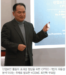 ¸¶Áö¸·À¸·Î ±×´Â ¡°CPTED¸¦ »ê¾÷º¸¾È ºÐ¾ß¿¡ Àû¿ë½ÃŰ´Â µ¥ ÀÖ¾î °¡Àå Áß¿äÇÑ Æ÷ÀÎÆ®´Â ¹Ù·Î CPTED°¡ º¸¾È¾÷¹«¿Í È¿°úÀûÀ¸·Î Á¢¸ñµÅ ȸ»çÀÇ È¿À²¼ºÀ» Áõ´ë½Ã۰í, ºñÁî´Ï½º¿¡ Å« µµ¿òÀ» ÁÙ ¼ö ÀÖ´À³Ä¶ó´Â °Í¡±À̶ó¸ç, ¡°À̰ÍÀº ¾ÕÀ¸·Î ±â¾÷º¸¾ÈÃ¥ÀÓÀÚµéÀÇ ¿ªÇÒ°ú ´É·Â¿¡ ´Þ·ÁÀÖ´Ù¡±°í ¸»ÇÏ¸ç °¿¬À» ¸¶¹«¸®Çß´Ù.