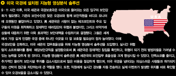 ƯÈ÷, Áö´ÉÇü ¿µ»óºÐ¼® ½Ã½ºÅÛÀº ³×Æ®¿öÅ©ÈµÈ ¿µ»ó°ü¸® ¼Ö·ç¼ÇÀ» ÅëÇØ ¿©·¯ °÷¿¡ ºÐ»êµÈ Àåºñ¿Í ±¤¹üÀ§ÇÑ ¿Ü°ûÁö¿ªÀ» °¡Áø ȯ°æ¿¡¼ º¸´Ù ºü¸¥ »óȲ ÆÄ¾ÇÀ» °¡´ÉÄÉ ÇÑ´Ù. IP Ä«¸Þ¶ó, ºñµð¿À ¼¹ö °°Àº ±â±â¿¡ ³»ÀåµÈ ¿µ»óºÐ¼® ¼Ö·ç¼ÇÀÌ »óȲÀÌ ½É°¢ÇØÁö±â Àü¿¡ ¹Ì¸® º¸¾È Áö¿ª ³»¿¡ ÀÖ´Â ¼ö»óÇÑ ÇൿµéÀ» ÀÚµ¿ÀûÀ¸·Î ½Äº°ÇÏ°Ô µÇ´Â °ÍÀÌ´Ù. ¿¹¸¦ µé¸é ¿µ»óºÐ¼® ¼Ö·ç¼ÇÀº ½Ç½Ã°£ ¹°Ã¼ ŽÁö¡¤½Äº°¡¤ºÐ¼®À» À§ÇÏ¿© °¡»óÀÇ ¹æ¾î¼±À» ¼³Á¤ÇÒ ¼ö ÀÖ´Ù. ¶ÇÇÑ, »ç¶÷ÀÌ ¾î½½··°Å¸®´Â Çൿ, Æó±âµÈ ¹°Ã¼, ºÀ¼âµÈ Ãⱸ, Ä«¸Þ¶ó º¯°æ ȤÀº ±³Ã¼¸¦ ÀÚµ¿ÀûÀ¸·Î °¨ÁöÇÒ ¼öµµ ÀÖ´Ù. ÀÌ ±â´ÉÀº Áß¾ÓÅëÁ¦½Ç¿¡¼ ±× ¼ö°¡ Á¦ÇÑµÈ º¸¾È ¸ð´ÏÅ͸µ ¿ä¿øÀÇ È¿À²¼ºÀ» ³ôÀÌ´Â ¿äÀÎÀÌ µÈ´Ù.