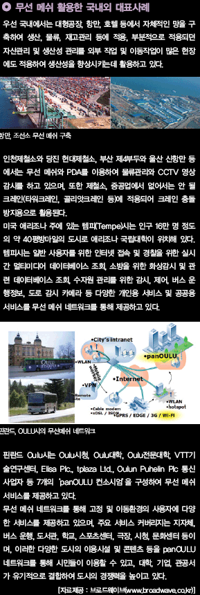 ¹«¼± ¸Þ½¬¸¦ ÀÌ¿ëÇÒ ¼ö ÀÖ´Â ´ëÁß±³Åë ÁöÇÏö»Ó¸¸ÀÌ ¾Æ´Ï´Ù. ÃÖ±Ù À¯Çàó·³ ¹øÁö°í ÀÖ´Â u-City¿Í ÅëÇÕ°üÁ¦¼¾ÅÍ¿¡µµ ÀÌ ¹«¼±¸Þ½¬ ±â¼úÀÌ µé¾î°£´Ù. u-City´Â À¯ºñÄõÅͽº ±â¼úÀ» ÀÌ¿ëÇϱâ À§ÇØ ¹«¼± ¸Þ½¬¸¦ ±¸ÃàÇϰí ÅëÇÕ°üÁ¦¼¾ÅÍ´Â °¢ ÁöÀÚüÀÇ ¸ðµç CCTV ¿µ»óÀ» ÅëÇÕÇÏ¸é¼ ¹«¼± ¸Þ½¬¸¦ »ç¿ëÇÑ´Ù. ¿¹¸¦ µé¸é û°èõÀº Áö¸®Àû Ư¼º»ó Åë½Å¸ÁÀ» ¼³Ä¡ÇÒ ¼ö ¾ø¾î ¹«¼± ¸Þ½¬¸¦ ÀÌ¿ëÇØ CCTV¸¦ ¿¬°áÇß°í, ºÎ»ê½Ã´Â u-City¸¦ ±¸ÃàÇÏ¸é¼ ÇØ¿î´ë Àϴ븦 Æ÷ÇÔÇÑ ¿©·¯ °÷¿¡ ¹«¼± ¸Þ½¬¸¦ ±¸ÃàÇß´Ù. À̹ۿ¡µµ Áö¸®Àû Ư¼º»ó ÄÉÀ̺íÀ» ¼³Ä¡ÇÒ ¼ö ¾ø´Â ¹®ÈÀ糪 °ü±¤Áö¿¡µµ ¹«¼± ¸Þ½¬°¡ ´ë¾ÈÀÌ µÇ°í ÀÖ´Ù.