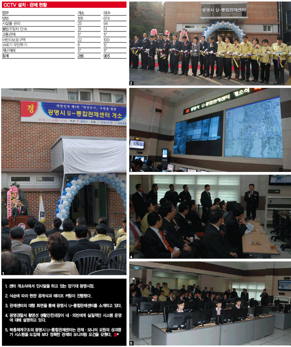 ƯÈ÷, ±¤¸í½Ã U-ÅëÇÕ°üÁ¦¼¾ÅÍ´Â ¹æ¹ü¿ë CCTV(674´ë)¿Í ÇàÁ¤¿ë CCTV(291´ë)¸¦ ÇϳªÀÇ ¿î¿µ ½Ã½ºÅÛ »ó¿¡¼ ±â´ÉÀûÀ¸·Î »óÈ£ ¿¬µ¿ÇÒ ¼ö ÀÖ°Ô ÅëÇÕÇϰí, µµ½ÃÀÇ ¸ðµç ±â´ÉÀ» ¸Á¶óÇÏ¿© ½Ã¹ÎÀÌ ÇÊ¿ä·Î ÇÏ´Â ¼ºñ½º¸¦ ±¸ÇöÇß´Ù.