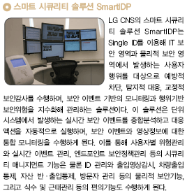 LG CNS°¡ Áö³ 2007³â °³¹ßÀ» ¿Ï·áÇÑ ÈÄ, ¿À·£ ±â°£ Å×½ºÆ® ¹× ½ÃÇ輳ġ °úÁ¤À» °ÅÃÄ Áö³ÇغÎÅÍ ¹°¸®Àû º¸¾È½ÃÀå¿¡ º»°ÝÀûÀ¸·Î ¼±º¸ÀÎ ½º¸¶Æ® ½ÃÅ¥¸®Æ¼ ¼Ö·ç¼ÇÀº Áö´ÉÇü À¶ÇÕº¸¾È ¼ÒÇÁÆ®¿þ¾îÀÎ SmartIDP¿Í ÃâÀÔÅëÁ¦ ¼Ö·ç¼ÇÀÎ ¡¸XID 1000¡¹ ¹× ¡¸XSmart¡¹¸¦ ÃÑĪÇÏ´Â °³³äÀÌ´Ù. ÀÌ¿Í °ü·Ã ±èȲ±â ÆÀÀåÀº ¡°½º¸¶Æ® ½ÃÅ¥¸®Æ¼´Â IT°¡ ´Ù¾çÇÑ º¸¾È±â¼ú°ú À¶ÇÕÇÏ¿© ÄÁ¹öÀü½º, ÀÎÅÚ¸®Àü½º, ¸ðºô¸®Æ¼¸¦ °¡´ÉÇÏ°Ô ÇÏ´Â ±â¼úÀ» ÀǹÌÇÏ´Â °Í¡±À̶ó¸ç, ¡°À̸¦ ÅëÇØ ¿¹¹æ Â÷¿øÀÇ Á¢±ÙÀÌ °¡´ÉÇϸç, ½ÃÅ¥¸®Æ¼¸¦ ³Ñ¾î ¼¼ÀÌÇÁƼ¿Í µðÆæ½º±îÁö ¸ðµÎ °¡´ÉÄÉ ÇÏ´Â °Í¡±À̶ó°í ¼³¸íÇß´Ù. ¹«¾ùº¸´Ù ȸ»ç ³»¿¡¼ ¹ß»ýÇÏ´Â ·Î±×¸¦ ÅëÇÕÇØ ÀÇ¹Ì ÀÖ´Â µ¥ÀÌÅ͸¦ ÃßÃâÇϰí, À̸¦ À§Çèµµ¿¡ µû¶ó ¹Ì¸® ÀÎÁöÇÒ ¼ö ÀÖ´Â °ÍÀÌ ¹Ù·Î ½º¸¶Æ® ½ÃÅ¥¸®Æ¼ ¼Ö·ç¼ÇÀÇ ÇÙ½ÉÀ̶ó´Â °ÍÀÌ´Ù.