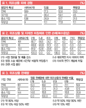 ÀÌ ½ÇÅÂÁ¶»ç¿¡ µû¸£¸é ¼³¹®¿¡ ÀÀ´äÇÑ 536°³ Áß¼Ò±â¾÷ Áß 26.9%(144°³)°¡ ¦ÅüÀ¸·Î ÀÎÇØ ÇÇÇØ¸¦ º» °ÍÀ¸·Î ³ªÅ¸³µ´Ù. ¼³¹®¿¡ ÀÀÇÑ Áß¼Ò±â¾÷ Áß ÇÇÇØ¸¦ °æÇèÇÑ °÷Àº 118°³(81.9%) »ç·Î, ÀÌ ±â¾÷µéÀº ½ÃÀåÁ¡À¯À²°ú ¸ÅÃâ¾× °¨¼Ò¸¦ °æÇèÇß´Ù°í ¹àÇû´Ù. ¶ÇÇÑ Â¦Åü ÆÇ¸Å·®ÀÌ Á¤Ç° ÆÇ¸Å·®ÀÇ 50% ÀÌ»óÀÎ Áß¼Ò±â¾÷µµ 48°³(33.4%) »ç¿¡ ´ÞÇÏ´Â °ÍÀ¸·Î ³ªÅ¸³µ´Ù. ƯÈ÷, ¦ÅüÀÇ ÆÇ¸Å·®ÀÌ Á¤Ç° ÆÇ¸Å·®ÀÇ 80% ÀÌ»óÀÎ ´ë±â¾÷ÀÇ »ç·Ê´Â Á¶»çµÇÁö ¾ÊÀº ¹Ý¸é, Áß¼Ò±â¾÷Àº 21°³(14.6%) »ç³ª µÅ Áß¼Ò±â¾÷ÀÌ Â¦Åü¿¡ ÀÇÇÑ ÇÇÇØ¿¡ Ãë¾àÇÑ °ÍÀ¸·Î µå·¯³µ´Ù.