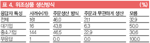 ÇÇÇØ ±â¾÷¿¡ µû¸£¸é ¦ÅüÀº ÁÖ·Î ÁÖ¹®¿¡ ÀÇÇØ »ý»ê(46.0%, 74°³)µÇ³ª, ÁÖ¹®¿¡ »ó°ü¾øÀÌ Áö¼ÓÀûÀ¸·Î »ý»êµÇ´Â °æ¿ìµµ ÀüüÀÇ 21.1%(34°³)³ª µÇ´Â °ÍÀ¸·Î ³ªÅ¸³µ´Ù. ƯÈ÷, ´ë±â¾÷ÀÇ °æ¿ì 16°³ ±â¾÷ Áß 1°³ ±â¾÷¸¸ÀÌ ÁÖ¹®¿¡ »ó°ü¾øÀÌ »ý»êµÇ¾úÁö¸¸, Áß¼Ò±â¾÷ÀÇ °æ¿ì´Â 33°³ ±â¾÷(22.9%)ÀÇ Á¦Ç°ÀÌ ÁÖ¹®¿¡ »ó°ü¾øÀÌ Áö¼ÓÀûÀ¸·Î »ý»êµÇ´Â °ÍÀ¸·Î Á¶»çµÇ¾î Áß¼Ò±â¾÷ Á¦Ç°¿¡ ´ëÇÑ Â¦Åü»ý»êÀÌ ´ë±â¾÷¿¡ ºñÇØ ¿ÀÈ÷·Á ¸¹À» °ÍÀ¸·Î ÃßÁ¤µÈ´Ù.