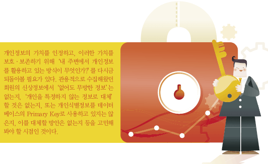 ÈÞ´ëÀüȱâ±âÀÇ ÀϷùøÈ£¸¦ °³ÀÎÁ¤º¸·Î ÀνÄÇÏ¿© º¸È£´ë»óÀ¸·Î °ü¸®ÇØ¾ß ÇÏ´Â ½Ã´ë¸¦ ¿ì¸®´Â ¸ÂÀÌÇϰí ÀÖ´Ù. °³ÀÎÁ¤º¸ÀÇ °¡Ä¡¸¦ ÀÎÁ¤Çϰí, ÀÌ·¯ÇÑ °¡Ä¡¸¦ º¸È£¡¤º¸Á¸Çϱâ À§ÇØ ¡®³» ÁÖº¯¿¡¼ °³ÀÎÁ¤º¸¸¦ Ȱ¿ëÇϰí ÀÖ´Â ¹æ½ÄÀÌ ¹«¾ùÀΰ¡?¡¯¸¦ ´Ù½Ã±Ý µÇµ¹¾Æº¼ Çʿ䰡 ÀÖ´Ù. °ü¿ëÀûÀ¸·Î ¼öÁýÇØ¿Ô´ø ȸ¿øÀÇ ½Å»óÁ¤º¸¿¡¼ ¡®¾ø¾îµµ ¹«¹æÇÑ Á¤º¸¡¯´Â ¾ø´ÂÁö, ¡®°³ÀÎÀ» ƯÁ¤ÇÏÁö ¾Ê´Â Á¤º¸·Î ´ëü¡¯ÇÒ °ÍÀº ¾ø´ÂÁö, ¶Ç´Â °³Àνĺ°Á¤º¸¸¦ µ¥ÀÌÅͺ£À̽ºÀÇ Primary Key·Î »ç¿ëÇϰí ÀÖÁö´Â ¾ÊÀºÁö, À̸¦ ´ëüÇÒ ¹æ¾ÈÀº ¾ø´ÂÁö µîÀ» °í¹ÎÇØ ºÁ¾ß ÇÒ ½ÃÁ¡ÀÎ °ÍÀÌ´Ù.