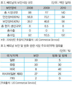 º£Æ®³²ÀÇ º¸¾ÈÀåºñ½ÃÀå ±Ô¸ð´Â 2008³â 9,800¸¸ ´Þ·¯¿¡¼ 2009³â 1¾ï ´Þ·¯·Î È®´ëµÆÀ¸¸ç, 2010³â¿¡µµ 1¾ï 4,000¸¸ ´Þ·¯·Î ¿¹»óµÇ´Â µî ¼ºÀå¼¼°¡ °¡ÆÄ¸£´Ù. ÀϺΠº¸¾ÈÀåºñÀÇ ¼öÀÔÀº º£Æ®³² Á¤ºÎÀÇ ½ÂÀÎÀÌ ÇÊ¿äÇϳª ÇöÀç º£Æ®³²ÀÇ º¸¾ÈÀåºñ½ÃÀåÀº ¼öÀÔ¿¡ Àý´ëÀûÀ¸·Î ÀÇÁ¸ÇÏ´Â »óȲÀ¸·Î ÃÖ±ÙÀÇ º¸¾È½ÃÀå È®´ë¿¡ ºñ·ÊÇØ ¼öÀÔµµ Áõ°¡Çϰí ÀÖ´Ù.