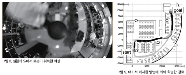 ¿ì¼± ÇнÀ ´Ü°è¿¡¼´Â Àü¹æÀ§ Ä«¸Þ¶ó¿Í ÀÎÄÚ´õ ¼¾¼¸¦ žÀçÇÑ ·Îº¿ÀÌ Àΰ£ÀÇ Á¶Á¾¿¡ ÀÇÇØ ÀÌ ¹æ¹ýÀ» ÀÌ¿ëÇÏ¿© ÀÚ±âÀ§Ä¡ ÃßÁ¤°ú Áöµµ ±¸ÃàÀ» ½Ç½ÃÇÏ¸é¼ À̵¿ÇÑ´Ù. ±×¸² 7Àº ȯ°æÀÇ ½ÇÁ¦ °ª Áöµµ¿Í ÇнÀ ´Ü°è¿¡¼ ·Îº¿À» À̵¿½ÃŲ ¼ø¼¸¦ ³ªÅ¸³»°í ÀÖÀ¸¸ç, ¿ì¼± ¿ÞÂÊ ¾Æ·¡ÀÇ ½Ç¼±À¸·Î ³ªÅ¸³½ ÀÛÀº ·çÇÁ¸¦ 2¹ÙÄû ȸÀü, ´ÙÀ½À¸·Î ¿À¸¥ÂÊ À§·Î À̵¿ÇØ °Å±â¿¡¼ Á¡¼±À¸·Î ³ªÅ¸³½ Å« ·çÇÁ¸¦ 2¹ÙÄû ȸÀü½ÃÄ×´Ù. ±×¸² 10Àº ÀÌ»óÀÇ °æ·Î¿¡ ´ëÇØ Ä«¸Þ¶óÀÇ Á¤º¸¸¦ »ç¿ëÇÏÁö ¾Ê°í ¿Àµå¸ÞÆ®¸®¸¸À¸·Î °è»êÇÑ ·Îº¿ÀÇ °æ·ÎÀÌ´Ù.