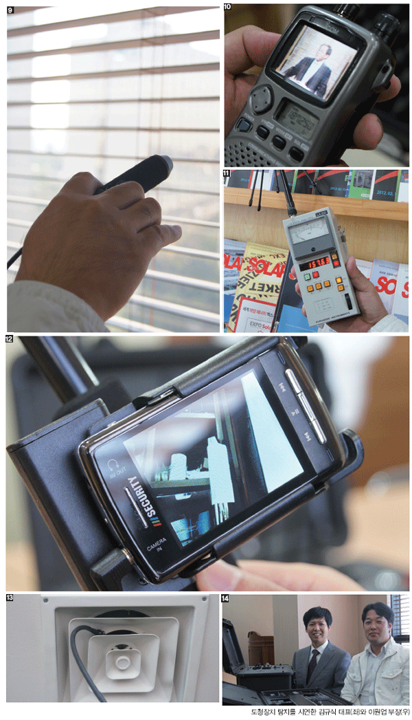 µµÃ»ÀåÄ¡ÀÇ Á֯ļö¸¦ ŽÁöÇÏ´Â ÀÌ ±â±âµéÀº ¸ÕÀú ¾Õ¼ ¼³¸íÇÑ ´ëÇüÀåºñ·Î ´ë·«ÀûÀÎ À§Ä¡¸¦ ÆÄ¾ÇÇÑ ¼ö Á¤¹Ð°Ë»ç¸¦ ÇÒ ¶§ »ç¿ëÇÑ´Ù. TV ½ÅÈ£¸¦ Àâ¾Æ ½Ã¿¬À» ÇÑ ÀÌ Àåºñ(»çÁø 9)´Â ¸ôÄ«Çü IP CCTVÀÇ ½ÅÈ£¸¦ Àâ¾Æ LCD·Î º¸¿©ÁÖ¸ç, ¶Ç ´Ù¸¥ Àåºñ(»çÁø 11)´Â µµÃ»ÀåÄ¡ÀÇ Á֯ļö¸¦ ÆÄ¾ÇÇØ À§Ä¡¸¦ ¾Ë·ÁÁØ´Ù. À°¾È°Ë»ç¸¦ ÇÒ ¶§ Á÷Á¢ È®ÀÎÇϱ⠾î·Á¿î õÀåÀ̳ª º® µîÀÇ Æ´À» ÅëÇØ È®ÀÎÇÏ´Â Ä«¸Þ¶ó(»çÁø 12, 13)µµ Çʼö Àåºñ Áß¿¡ Çϳª´Ù.
