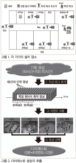 ±×¸² 1Àº À¯Ä¡¿øÀÇ ¾à½Äµµ¿Í °¢ ±â±âÀÇ ¼³Ä¡ Àå¼Ò¸¦ ³ªÅ¸³»°í ÀÖ´Ù. °íÁ¤ °¨½Ã Ä«¸Þ¶ó¸¦ º¸À°½Ç, ÈÞ°Ô½Ç, º¹µµ, Çö°üÀ̶ó°í ÇÏ´Â ¿ø¾Æ°¡ ÀÚÁÖ »ç¿ëÇÏ´Â Àå¼Ò¸¦ Áß½ÉÀ¸·Î ¼³Ä¡ÇÏ¿© ¿ø³» »ýȰÀ» ±â·ÏÇÑ´Ù. ÇÕ°è 7´ëÀÇ Ä«¸Þ¶ó¿¡ ÀÇÇØ ¿ø³» »ýȰÀÌ ±â·ÏµÇÁö¸¸, ƯÁ¤ ¿ø¾ÆÀÇ ´ÙÀÌÁ¦½ºÆ® »ý¼º¿¡ ÇÊ¿äÇÑ °ÍÀº ±× ¿ø¾Æ°¡ ÃÔ¿µµÈ ¿µ»ó»ÓÀÌ´Ù. °¢ ¿ø¾Æ°¡ ¾ðÁ¦ ¾î´À Ä«¸Þ¶ó¿¡ ÂïÇô ÀÖ´ÂÁö¸¦ ÆÄ¾ÇÇϱâ À§ÇØ ¿ì¸®´Â ¹«¼± ű׸¦ ÀÌ¿ëÇÑ´Ù. »ç¿ëÇÑ ¹«¼± ű״ 1ÃÊ °£°ÝÀ¸·Î ½ÅÈ£¸¦ °è¼Ó ¼Û½ÅÇϱ⠶§¹®¿¡, ¿ø¾ÆµéÀº Ç×»ó ¸ö¿¡ ´Þ°í ÀÖ´Â »óÅ·ΠÇϷ縦 º¸³½´Ù. Ä«¸Þ¶ó ¿·¿¡ º´¼³µÈ ¹«¼± ÅÂ±× ¼ö½Å±â°¡ ½ÅÈ£¸¦ ÀâÀ½À¸·Î½á ¿ø¾ÆÀÇ À§Ä¡ Á¤º¸°¡ ±â·ÏµÇ´Â ±¸Á¶·Î µÇ¾î ÀÖ´Ù.