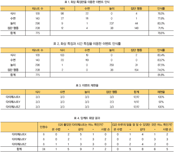 Ç¥ 1Àº 3°³ÀÇ È­»ó Ư¡¸¸À» ÀÌ¿ëÇØ À̺¥Æ® ½Äº° ½ÇÇèÀ» ½Ç½ÃÇÑ °á°úÀÌ´Ù. ÀνķüÀº ½Ä»ç, ¼ö¸é, ³îÀÌ, Áý´ÜÇൿÀÇ ¼ø¼­·Î °¢°¢ 76.5%, 77.6%, 80.0%, 71.1%À̸ç, ÀüüÀûÀ¸·Î´Â 76.6%ÀÌ´Ù. ÀÌ °á°ú´Â È­»ó Ư¡¸¸À¸·Î ÇÏ·ç À̺¥Æ®ÀÇ 80% ¹Ì¸¸À» ÀνÄÇÒ ¼ö ÀÖ´Ù´Â °ÍÀ» ³ªÅ¸³»°í ÀÖ´Ù.