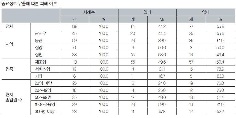 À̹ø ¹ßÇ¥¿¡ ÀÇÇϸé Áß±¹¿¡ ÁøÃâÇÑ Áß¼Ò±â¾÷ 138°³ »ç Áß 44.2%ÀÎ 61°³ »ç°¡ ÇöÁö ÁøÃâ ÀÌÈÄ È¸»ç ³»ºÎÀÇ Áß¿äÁ¤º¸°¡ ¿ÜºÎ·Î À¯ÃâµÇ¾î ÇÇÇØ¸¦ ÀÔÀº ÀûÀÌ ÀÖÀ¸¸ç, ±×Áß 2¹ø À¯ÃâµÈ ȸ»ç°¡ 16°³ »ç¿´°í 3¹ø ÀÌ»óµµ 4°³ »ç¿¡ ´ÞÇÏ´Â °ÍÀ¸·Î ¾Ë·ÁÁ³´Ù. ÀÌ´Â Áö³ 2010³â Á¶»çµÈ ¿¬±¸¼Ò º¸À¯ Áß¼Ò±â¾÷ÀÇ »ê¾÷±â¹Ð À¯ÃâºñÀ² 13.0%¿¡ ºñÇØ »ó´çÈ÷ ³ô¾ÆÁø ¼öÄ¡´Ù.