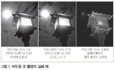 ¾îµÎ¿î °÷¿¡¼ÀÇ ÃÔ¿µÀÌ ¾î·Á¿î ÀÌÀ¯¿¡´Â ¿ì¼±, ³ë±¤ ºÎÁ·À» º¸ÃæÇϱâ À§ÇØ ³ë±¤ ½Ã°£À» ±æ°Ô ÇÏ¸é ¼Õ ¶³¸²À̳ª ÇÇ»çüÀÇ ¿òÁ÷ÀÓ¿¡ ÀÇÇÑ º¸ÄÉ(Bokeh)°¡ »ý±â°í, ¼ö±¤ °¨µµ¸¦ ³ô¿© ³ë±¤ ½Ã°£À» ª°Ô ÇÏ¸é °í°¨µµ ³ëÀÌÁî°¡ ÇöÀúÇØ Áö´Â Æ®·¹À̵å¿ÀÇÁ ¹®Á¦°¡ »ý±ä´Ù(±×¸² 1). ´õ¿íÀÌ ¶óÀÌÆ® ¾÷ µÈ Àå¸éÀ» ÃÔ¿µÇÏ°Ô µÇ¸é ºÐÀ§±â¸¦ ¿¬ÃâÇÏ´Â ÃкÒÀ̳ª ¶óÀÌÆ® µîÀÇ ±¤¿øÀ̳ª ±¤·®À» º¸È£ÇÒ Çʿ䰡 ÀÖ¾î ³í Ç÷¡½Ã¿¡¼ÀÇ ÃÔ¿µÀ̳ª Ç÷¡½Ã¸¦ ¹Ù¿î½º ½ÃŲ ÃÔ¿µÀÌ ÇÊ¿äÇÏ´Ù. ÀÌ °æ¿ì, ³ë±¤ ºÎÁ·¿¡ ÀÇÇØ ´õ¿í ½ÉÇØÁ® ¾Õ¿¡¼ ±â¼úÇÑ º¸ÄÉ¿Í ³ëÀÌÁîÀÇ ¹®Á¦°¡ º¸´Ù È®½ÇÈ÷ µå·¯³´Ù.