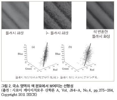 È»óÀÇ ±¹¼ÒÀûÀÎ ¿µ¿ªÀÌ °¡Áö´Â ¼ºÁú·Î¼ »ö¼±Çü¼º(Color-Line)7)À̶ó°í ÇÏ´Â »ö ºÐÆ÷°¡ Á÷¼±À̳ª Æò¸éÀûÀ¸·Î ÆÛÁö´Â Ư¡ÀÌ ÀÖÀ¸¸ç(±×¸² 2) ±¹¼ÒÀûÀÎ »ö º¯È°¡ À½¿µ¿¡ ÀÇÇÑ ¸í¾Ï õÀ̳ª »öÀÌ ´Ù¸¥ ¿µ¿ª °æ°è¿¡¼ÀÇ È¥ÇÕ¿¡ ÀÇÇØ ¹ß»ýÇÏ´Â °Í¿¡ ±âÀÎÇϰí ÀÖ´Ù. »ö¼±Çü¼ºÀº Ç÷¡½Ã È»ó°ú ³í Ç÷¡½Ã È»óÀÌ ¸ðµÎ °¡Áö°í ÀÖÀ¸¸ç »ö ºÐÆ÷ ÃàÀÇ ±â¿ï±â¿Í ÀýÆí(ï·ø¸)ÀÌ ´Ù¸£´Ù. ÀÌ °æ¿ì »ö ºÐÆ÷ Çü»óÀ» ¾ÆÇÉ º¯È¯À¸·Î º¯ÇüÇÔÀ¸·Î½á ±¹¼Ò ¿µ¿ªÀÇ »ö䳪 À½¿µÀ» Èä³» ³¾ ¼ö ÀÖ´Ù.