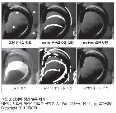 ±×¸² 3Àº À½¿µÀÇ °æ°è¿¡ »ý±ä ¾ó·è(±×¸² ¼ÓÀÇ È»ìÇ¥)°ú ±× º¸Á¤¿¡ À¯È¿ÇÏ´Ù°í »ý°¢µÇ´Â µÎ ¼ö¹ýÀ» ³ªÅ¸³½ °ÍÀ¸·Î »ó´ÜÀº Inpaint 󸮿¡ ÀÇÇÑ º¸ÃæÀ» ÀÌ¿ëÇÑ º¸Á¤¹ý(Photoshop CS5 žÀç ±â´ÉÀ» »ç¿ë), ÇÏ´ÜÀº ¿ì¸®°¡ ä¿ëÇÑ ¾ÆÄ¡ ÆÑÆ® Á¦°Å¹ý 10)°ú ÀÚµ¿ º¸Á¤ÀÇ °á°úÀÌ´Ù.