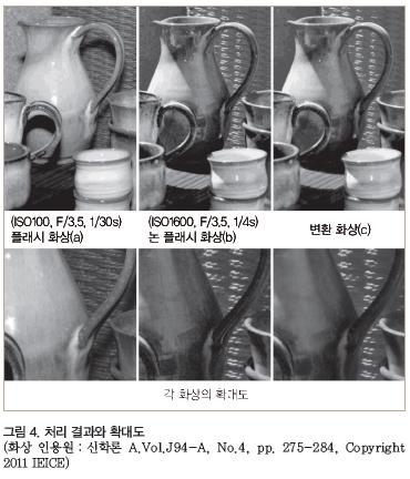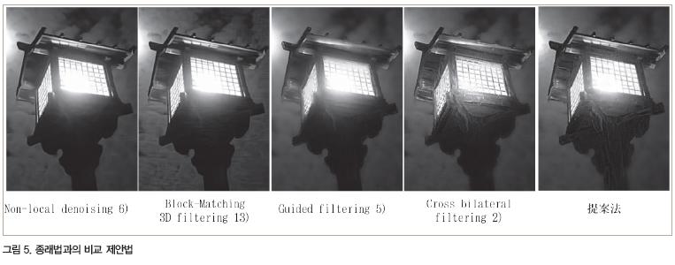±×¸² 5´Â Á¾·¡¹ý°úÀÇ ±×¸²1À» ÀÌ¿ëÇÑ ºñ±³ °á°ú¸¦ ³ªÅ¸³»°í ÀÖ´Ù. ¿ì¼±, ÁÂÃøÀÇ ¹æ¹ýÀº ´ÜÀÏ È»óÀ¸·ÎºÎÅÍÀÇ ÆòȰȹý6) 13)À¸·Î ³í Ç÷¡½Ã È»ó¸¸À» ÀÌ¿ëÇØ ³ëÀÌÁî Á¦°Å¸¦ ½Ç½ÃÇϰí ÀÖ´Ù. ¹®Á¦Á¡À¸·Î´Â ¹è°æ¿¡ »ý±ä »ö ¹Ù·¥°ú ³ª¹µ°á µîÀÇ Á¾·¡ ºÒ¼±¸íÇÑ ºÎºÐÀº ¼±¸íÇÑ »óÅ·δ ȸº¹ÇÒ ¼ö ¾ø´Ù´Â Á¡À» µé ¼ö ÀÖ´Ù. ´ÙÀ½À¸·Î, ¿ìÃøÀÇ 3¼ö¹ýÀº Ç÷¡½Ã È»ó°ú ³í Ç÷¡½Ã È»óÀ» ÀÌ¿ëÇØ ³ëÀÌÁî Á¦°Å¸¦ ½Ç½ÃÇÏ´Â ¼ö¹ýÀÌ´Ù.