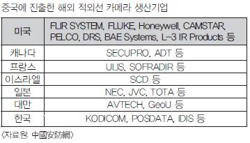 ±¹¿Ü ´ëÇ¥±â¾÷À¸·Î´Â ¹Ì±¹ÀÇ FLIR SYSTEM, FLUKE, Honeywell, CAMSTAR, PELCO, DRS, BAE Systems, L-3 IR Products, ij³ª´ÙÀÇ SECUPRO, ADT, ÇÁ¶û½ºÀÇ ULIS, SOFRADIR, À̽º¶ó¿¤ÀÇ SCD, ÀϺ»ÀÇ NEC, JVC, TOTA, ´ë¸¸ÀÇ AVTECH, GeoU, Çѱ¹ÀÇ KODICOM, POSDATA, IDIS µîÀÌ ÀÖ´Ù.