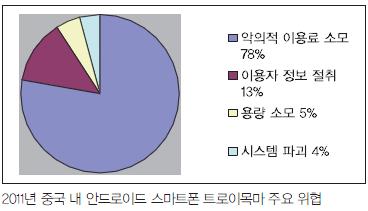 Áö³ÇØ Áß±¹¿¡¼ ¾Èµå·ÎÀ̵å(Android) OS ±â¹Ý ½º¸¶Æ®ÆùÀ» °Ü³ÉÇÑ Æ®·ÎÀ̸ñ¸¶ÀÇ ¸ñÇ¥´Â ¶Ñ·ÇÇß´Ù. Áï, ½º¸¶Æ®Æù ÀÌ¿ëÀÚÀÇ ÅëÈ¿ä±ÝÀ» ¸ô·¡ ¼Ò¸ð½ÃŰ´Â °Í. ÀÌ´Â ¾Èµå·ÎÀÌµå °Ü³É Æ®·ÎÀ̸ñ¸¶ÀÇ Àüü À§Çù °¡¿îµ¥ 78%¸¦ Â÷ÁöÇß´Ù. ÀÌ °°Àº Çö»óÀº ½Éºñ¾È OS ½º¸¶Æ®Æù¿¡ ´ëÇÑ Æ®·ÎÀ̸ñ¸¶ÀÇ À§Çù¿¡¼ ¡®¾ÇÀÇÀû ÀÌ¿ë·á ¼Ò¸ð¡¯°¡ 20% °¡·®¿¡ ¸Ó¹® °Í°ú ´ëÁ¶ÀûÀÌ´Ù. ÀÌ¾î ¾Èµå·ÎÀÌµå ±â¹Ý ½º¸¶Æ®ÆùÀ» °Ü´« Æ®·ÎÀ̸ñ¸¶ Áß 13%´Â À̵¿Àüȱ⳻ ¿¬¶ôó, »çÁø, ´Ü¹® ¸Þ½ÃÁö, ´Ü¸»±â Á¤º¸ µî ÀÌ¿ëÀÚÀÇ ¡®°³ÀÎ Á¤º¸ ÀýÃ롯¸¦ ¸ñÇ¥·Î »ï¾Ò´Ù. ÀÌ¾î ½º¸¶Æ®Æù ¡®¿ë·® ¼Ò¸ð(5%)¡¯, ¡®½Ã½ºÅÛ ÆÄ±«(5%)¡¯ µîÀÇ À§ÇùÀÌ µÚ¸¦ À̾ú´Ù.