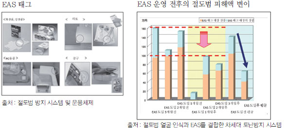 ÇöÀç, Àýµµ¹üÀ» ¹æÁöÇϱâ À§ÇØ °¢ ¸ÅÀå¿¡¼´Â EAS(Electronic Article Surveillance)¸¦ µµÀÔÇß´Ù. EAS¶õ »óǰ¿¡ Ư¼öÇÑ °ü¸® ű׸¦ ÀåÂøÇØ ÃâÀÔ±¸¿¡ ¼³Ä¡µÈ ¾ÈÅ׳ª¸¦ Åë°úÇϸé, ºûÀ̳ª ¾Ë¶÷À¸·Î ÁÖÀ§¿¡ ¾Ë¸®´Â ÀüÀÚ½Ä »óǰ °¨½Ã ½Ã½ºÅÛÀ¸·Î Àýµµ¹ü ¹æÁö¿Í ¿ÀÇ Áø¿¿¡ µû¸¥ ¸ÅÃâ Áõ°¡¿¡ ±â¿©Çϰí ÀÖÀ¸¸ç °í°´ÀÇ ÄèÀûÇÑ ¼îÇΠȯ°æÀ» Á¶¼ºÇÏ´Â µî »çȸ ÀÎÇÁ¶ó·Î ¶°¿À¸£°í ÀÖ´Ù. ÀÌ·¯ÇÑ EAS¿¡ ÁÖ·Î ¾²À̴ ŸÀÔÀ¸·Î´Â À½Çâ Àڱ⠹æ½Ä, RF ¹æ½Ä, Àڱ⠹æ½Ä, ÀÚ¸í ¹æ½ÄÀÇ 4Á¾·ù°¡ ÀÖÀ¸¸ç À̿ܿ¡µµ ¾ÈÅ׳ª ŸÀÔ, °ÔÀÌÆ® ŸÀÔ, õÀå ŸÀÔ, ¸ÅÆ® ŸÀÔ, µµ¾î ŸÀÔ, ·çÇÁ ŸÀÔ µî ´Ù¾çÇÏ´Ù.