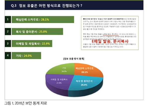 °ü°ø¼´Â ¹°·Ð ±â¾÷¸¶´Ù ÀÌÁ¦´Â º¸¾È´ã´çºÎ¼°¡ Á¶Á÷µÉ ¸¸Å °³ÀÎÁ¤º¸º¸È£ ¹× ±â¹ÐÀ¯Ãâ ¹æÁö¸¦ À§ÇÑ Á¤Ã¥ÀÌ ¼¼¿öÁö°í ÀÖ´Ù. º¸¾ÈºÎ¼¿¡¼´Â ÁÖ·Î ÆÄÀÏÀ̳ª À̸ÞÀÏ, ¶Ç´Â USB µî ÀüÀÚÀûÀÎ ¹æ¹ýÀ¸·Î Á¤º¸°¡ À¯ÃâµÇ´Â °Í¿¡ ´ëÇÏ¿© Å©°Ô ¿ì·ÁÇØ¿Ô°í, À̸¦ ¹æÁöÇϱâ À§ÇØ Ä¡¹ÐÇÑ º¸¾È¸ÁÀ» ±¸ÃàÇÏ°í ¾÷±×·¹À̵å ÇÏ´Â µ¥ ÃÑ·ÂÀ» ±â¿ïÀδÙ. ±×·¯³ª Á¤º¸ À¯ÃâÀº ÀǿܷΠÀüÀÚÀûÀÎ ¹æ¹ýº¸´Ù´Â ¹°¸®ÀûÀÎ ¹æ¹ý¿¡¼ ´õ ¸¹ÀÌ ÀϾ´Â °ÍÀ¸·Î Á¶»çµÇ°í ÀÖ´Ù. µå¶ó¸¶³ª ¿µÈ¿¡¼Ã³·³ ÆÄÀϺ¹»ç µîÀÌ ¸¹ÀÌ ÀÌ·ïÁú °Í °°Áö¸¸, Á¶»ç °á°ú¸¦ º¸¸é ÀǿܷΠÇÙ½ÉÀη ½ºÄ«¿ìÆ®¿Í º¹»ç ¹× Á¾À̹®¼¿¡ ÀÇÇÑ Á¤º¸ À¯ÃâÀÌ 50%¸¦ Èǽ ³Ñ´Â ºñÁßÀ» Â÷ÁöÇÑ´Ù. ¾ó¸¶ Àü A»ç¿¡¼´Â Áß¿äÇÑ ³»ºÎ Àλç ÀÚ·á°¡ ¿ÜºÎ·Î À¯ÃâµÇ¾ú´Âµ¥, ¾Ë°í º¸´Ï ÆÑ½º·Î À¯ÃâµÈ °ÍÀ̾ú´Ù. ÇÏÁö¸¸ À̸¦ ´©°¡ ¾ðÁ¦ º¸³Â´ÂÁö¸¦ ¾Ë ¼ö ¾ø¾î ÃßÀûÀ» Æ÷±âÇÑ °æ¿ì°¡ ÀÖ¾ú´Ù. ÇϳªÀÇ »ç·Ê¸¦ ´õ µéÀÚ¸é, Á÷¿øµéÀÇ ¹®¼ »ç¿ë·®À» ºÐ¼®ÇÑ °á°ú, ÅðÁ÷ 3°³¿ù ÀüºÎÅÍ Á¾ÀÌ Ãâ·Â·®ÀÌ ±Þ°ÝÈ÷ Áõ°¡ÇÑ °ÍÀ¸·Î ÆÄ¾ÇµÇ¾ú´Ù. ¾ÕÀÇ »ç·Êó·³ º¹»ç³ª Àμâ, ÆÑ½º µîÀ» ÅëÇÑ Á¾À̹®¼ÀÇ Á¤º¸°ü¸®´Â ²À ÇÊ¿äÇÔ¿¡µµ °£°úÇß´ø ºÎºÐÀÌ´Ù. Á¤º¸°¡ À¯ÃâµÉ °¡´É¼ºÀº ³ôÁö¸¸ ÀÌ¿¡ ´ëÇÑ ´ëÀÀ ¹æ¹ý¿¡ ´ëÇØ¼´Â ÀüÇô ÁغñµÇ¾î ÀÖÁö ¾ÊÀº °æ¿ì°¡ ¸¹´Ù.