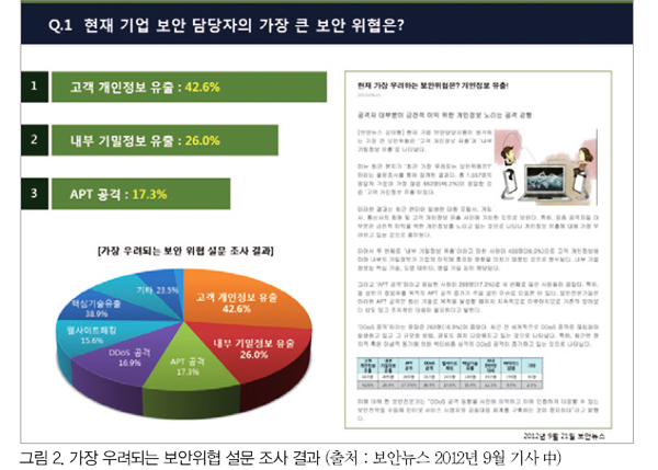 ±×·¸´Ù¸é º¸¾È ´ã´çÀÚµéÀÌ »ý°¢ÇÏ´Â °¡Àå Å« º¸¾È À§ÇùÀº ¹«¾ùÀϱî? º¸¾È´ã´çÀÚµéÀ» ´ë»óÀ¸·Î ÁøÇàÇÑ ¼³¹®Á¶»ç °á°ú¿¡ µû¸£¸é °¡Àå ¿ì·ÁµÇ´Â º¸¾È À§ÇùÀº ¿ÜºÎÀÇ ¡®ÇØÅ·¡¯ÀÌ ¾Æ´Ñ ¡®°í°´ °³ÀÎÁ¤º¸ À¯Ã⡯·Î ³ªÅ¸³µ´Ù. Å« À§ÇùÀÌ µÉ ¸¸ÇÑ Á¤º¸ À¯ÃâÀº ¿ÜºÎ Á÷¿ø¿¡ ÀÇÇØ¼ ¹ß»ýµÇ´Â °æ¿ì(14%) º¸´Ù Àü¡¤ÇöÁ÷ ³»ºÎ Á÷¿ø¿¡ ÀÇÇØ¼ ¹ß»ýµÇ´Â °æ¿ì(86%)°¡ ÈξÀ ¸¹´Ù´Â Á¡ÀÌ ÇÙ½ÉÀÌ´Ù. Á¤º¸ À¯Ãâ·Î ÀÎÇÑ ÇÇÇØ¾×ÀÌ ¾à 33Á¶¿øÀ̳ª µÈ´Ù´Â Çѱ¹ »ê¾÷º¸¾È¿¬±¸¼ÒÀÇ Á¶»ç°á°ú°¡ ÀÖ¾ú´Âµ¥, ÀÌ´Â ³»ºÎÀοøÀÇ ¹®¼ º¸¾È¡¤°ü¸®¸¦ öÀúÇÏ°Ô ÇÑ´Ù¸é ±Þ°ÝÈ÷ ÁÙÀÏ ¼ö ÀÖ´Â ±Ý¾×ÀÌ µÉ °ÍÀÌ´Ù.