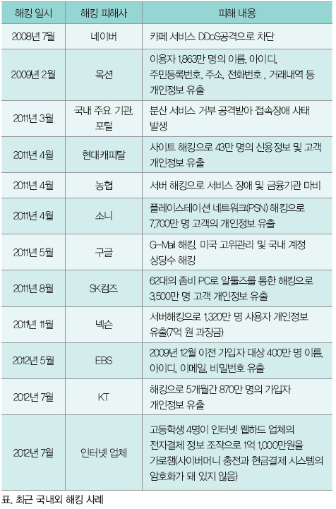 ÃÖ±Ù ±ÝÀ¶±â°ü ¹× Æ÷ÅÐ »çÀÌÆ®¿¡ ´ëÇÑ ÇØÄ¿µéÀÇ °ø°ÝÀ¸·Î ´ëÇü»ç°í°¡ ¹ß»ýÇÏ°í °³ÀÎÁ¤º¸º¸È£¹ýÀÌ ½ÃÇàµÇ¸é¼ µ¥ÀÌÅÍ¿¡ ´ëÇÑ º¸¾ÈÀÌ ¸Å¿ì Áß¿äÇÑ °úÁ¦·Î ¶°¿À¸£°í ÀÖÀ¸³ª, ±¹³»ÀÇ º¸¾È ¼Ö·ç¼ÇÀº ¾ÆÁ÷±îÁö ¹æÈº®, VPN Á¦Ç°°ú DB¾ÏÈ£È Á¦Ç°ÀÌ ÁÖ·ù¸¦ ÀÌ·ç°í ÀÖÀ¸¸ç, ±Ùº»ÀûÀ¸·Î ¿ÜºÎÀÇ °ø°ÝÀ» ¹Þ¾ÒÀ» ¶§ Á¤ÀÛ Áß¿äÇÑ Á¤º¸ÀÇ ³×Æ®¿öÅ©»ó¿¡¼ÀÇ º¸È£´Â ¸Å¿ì Ãë¾àÇÑ ½ÇÁ¤ÀÌ´Ù. ´õ±¸³ª ¸¹Àº ±â°ü°ú ±â¾÷µé¿¡¼ »ç¿ëÇÏ´Â º¸¾ÈÁ¦Ç°µµ º¸¾ÈÁ¤Ã¥À» Çã¼úÇÏ°Ô ¿î¿µÇÔÀ¸·Î½á Áß¿ä Á¤º¸ÀÇ º¸È£´Â ¾ÆÁ÷µµ °¥ ±æÀÌ ¸Õ ´À³¦ÀÌ´Ù.