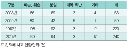 Çѱ¹¼ÒºñÀÚ¿ø¿¡ µû¸£¸é ÅÃ¹è »ç°í(ºÐ½Ç¡¤ÆÄ¼Õ¡¤°è¾àÀ§¹Ý µî)´Â Áö³ 2008³â 168°Ç¿¡¼ Áö³ÇØ 244°ÇÀ¸·Î ¾à 45%°¡·® Áõ°¡Çß´Ù. ¶ÇÇÑ, °æ±âµµ ¼ÒºñÀÚÁ¤º¸¼¾ÅͰ¡ µµ³» ¼ÒºñÀÚ 1,097¸í°ú 12°³ »ç¾÷ÀÚ¸¦ ´ë»óÀ¸·Î ÅÃ¹è ¼ºñ½º ÀÌ¿ë ¹× ¿î¿ë½ÇÅ ¼³¹®Á¶»ç¸¦ ½Ç½ÃÇÑ °á°ú, ÀÀ´äÀÚÀÇ 28.2%°¡ ÅÃ¹è ¼ºñ½º ÇÇÇØ¸¦ °æÇèÇß´Ù°í ´äÇß´Ù. ÇÇÇØ³»¿ëÀº ¡®¹°Ç° ÆÄ¼Õ¡¯ °ú ¡®¹°Ç° ºÐ½Ç¡¯ÀÌ °¡Àå ¸¹¾Ò°í ±× Áß 68.6%´Â ÇÇÇØº¸»óÀ» ¹ÞÁö ¸øÇß´Ù°í ÀÀ´äÇß´Ù. ÇÇÇØº¸»óÀ» ¹ÞÁö ¸øÇÑ ÀÌÀ¯·Î´Â ¡®Ã¥ÀÓ¼ÒÀç ÀÔÁõºÒ°¡¡¯ 41.2%, ¡®»ç¾÷ÀÚÀÇ Ã¥ÀÓȸÇÇ¡¯ 36.9% µîÀ̾ú´Ù. ÅÃ¹è ¼ºñ½º ÀÌ¿ë ½Ã °¡Àå ºÒÆíÇÑ Á¡À¸·Î´Â ¡®ºÎÀçÁß Ã³¸® ¹ÌÈí¡¯À¸·Î Á¶»çµÆÀ¸¸ç, °³¼±µÇ±æ ¹Ù¶ó´Â Á¡À¸·Î´Â ¡®¾ÈÀü¹è¼Û¡¯¿¡ °üÇÑ ÀǰßÀÌ °¡Àå ¸¹¾Ò´Ù. ÇöÀç ÅÃ¹è ¼ºñ½º¿¡¼´Â ¼ö½Å ¶Ç´Â ¹è¼Û¿¡ ´ëÇÑ ºÎÀιæÁö ¼ºñ½º¸¦ ¿Ïº®ÇÏ°Ô Á¦°øÇÏÁö ¸øÇϰí ÀÖÀ¸¸ç, ±âÁ¸ÀÇ ¼öÃëÀÎ ¼¸í ¶Ç´Â ´ë¸®ÀÎ ¼¸í¸¸À¸·Î´Â »ç°í¹ß»ý½Ã Áõ°ÅÀÚ·á·Î Ȱ¿ëÇϱ⿡´Â ºÎÁ·ÇÑ ¸éÀÌ ÀÖ´Ù.
