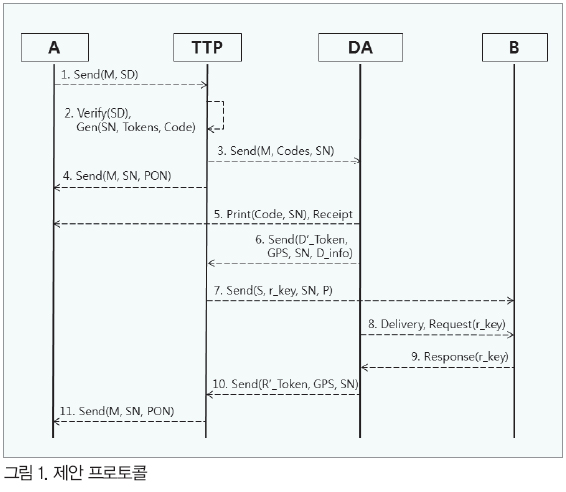 10.¼¸í °ËÁõ ¹× ¿Ï·á ÅëÁö : ¹è¼ÛÀÚ ´Ü¸»±â´Â ¼ö½ÅÀÚ°¡ ÀÔ·ÂÇÑ r_key·Î S_code¸¦ º¹È£ÈÇÑ ÈÄ R¡¯_token°ú SNÀ» ÇöÀç À§Ä¡Á¤º¸(GPS_info)¿Í ÇÔ²² TTP¿¡ ÀÚµ¿À¸·Î Àü¼ÛÇÑ´Ù. TTP´Â Àü¼Û¹ÞÀº SNÀ¸·Î 2) °ËÁõ ¹× ÄÚµå »ý¼º¿¡¼ »ý¼ºÇÑ R_token°ú Àü¼Û¹ÞÀº R¡¯_tokenÀ» ºñ±³ÇØ TTP°¡ »ý¼ºÇÑ ºÎÀιæÁö ÅäÅ«ÀÎÁö¸¦ °ËÁõÇÑ´Ù. °ËÁõ ÈÄ ¹è¼ÛÀÚ´Â ¼ö½ÅÀÚ¿¡°Ô ¹è¼ÛǰÀ» ÀΰèÇÑ´Ù.