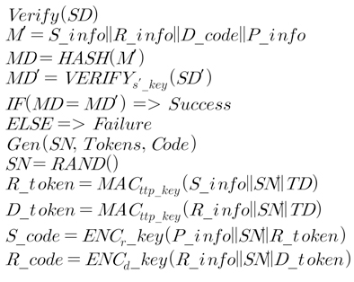2.°ËÁõ ¹× ÄÚµå »ý¼º : Àü¼Û ¹ÞÀº µ¥ÀÌÅÍ(M¡¯, SD¡¯)¿¡ ¹«°á¼º °ËÁõ°ú ¹ß½ÅÀÚ °ËÁõÀ» °ÅÄ£ ÈÄ, TTP´Â SN¸¦ »ý¼ºÇϰí, R_token°ú D_tokenÀ» »ý¼ºÇØ S_code, R_code¸¦ »ý¼ºÇÑ´Ù.