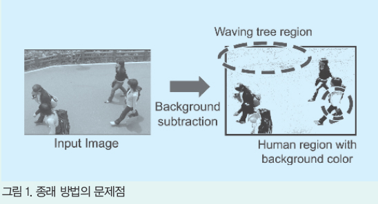 µ¿¿µ»ó¿¡¼ À̵¿ ¹°Ã¼¸¦ °ËÃâÇÏ´Â °ÍÀº Àι°ÀÇ ÃßÀûÀ̳ª Çൿ ÀÎ½Ä µî ´Ù¾çÇÑ ÄÄÇ»ÅÍ ºñÀü ±â¼ú¿¡ ÀÖ¾î¼ Áß¿äÇÑ ¿ªÇÒÀ» ´ã´çÇϰí ÀÖ´Ù. ±× ¶§¹®¿¡ º¸´Ù Á¤È®ÇÏ°í °í¼ÓÀ¸·Î À̵¿ ¹°Ã¼¿µ¿ªÀ» ÃßÃâÇϱâ À§ÇÑ ¿¬±¸°¡ Ȱ¹ßÇÏ°Ô ÀÌ·ç¾îÁö°í ÀÖ´Ù. È»ó Áß¿¡¼ »ç¶÷ µîÀÇ ¿µ¿ªÀ» ÃßÃâÇÏ´Â ¹æ¹ý Áß Çϳª·Î ¹è°æ Â÷ºÐ¹ýÀÌ ÀÖ´Ù. ¹è°æ Â÷ºÐ¹ýÀº ¹è°æÀÌ º¯ÈµÇÁö ¾Ê´Â Á¤ÀûÀÏ °æ¿ì¿¡ ¾ÈÁ¤µÇ°Ô À̵¿ ¹°Ã¼¿µ¿ªÀ» ÃßÃâÇÒ ¼ö ÀÖÁö¸¸ ¿Á¿Ü ȯ°æ¿¡¼´Â Á¶¸íÀ̳ª ¹°Ã¼ÀÇ ±×¸² ÀÚ¿¡ ¿µÇâÀ» ¹Þ¾Æ ¹°Ã¼¿µ¿ªÀ» °ú°ËÃâÇÒ ¿ì·Á°¡ ÀÖ´Ù. ¶Ç, ¹è°æÀÇ »ö°ú À̵¿ ¹°Ã¼ÀÇ »öÀÌ À¯»çÇÒ °æ¿ì¿¡ À̵¿ ¹°Ã¼¸¦ °ËÃâÇÒ ¼ö ¾ø´Ù´Â ¹®Á¦°¡ ÀÖ´Ù.