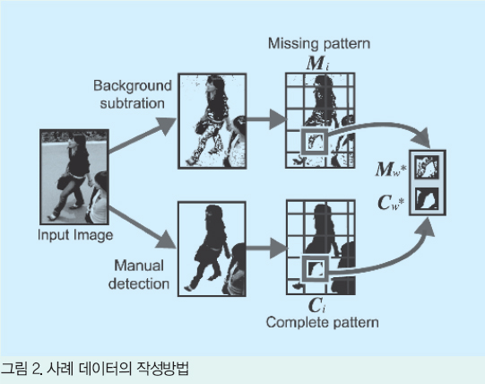 µ¿Àû ¹è°æ ¸ðµ¨À» »ç¿ëÇÑ ¹è°æ Â÷ºÐ¿¡ ÀÇÇØ »ý±ä Àι°¿µ¿ªÀÇ °á¼Õ¿¡ ´ëÇØ »ç·Ê µ¥ÀÌÅ͸¦ »ç¿ëÇØ¼ º¸¿ÏÇÏ´Â ¹®Á¦¸¦ ÃÖ¼ÒÈ ¹®Á¦·Î¼ Á¤½ÄÈÇÑ´Ù. »ç¿ëÇÏ´Â »ç·Ê µ¥ÀÌÅͺ£À̽º´Â Àι°¿µ¿ª °á¼Õ ÆÐÅÏ(ÀÌÇÏ °á¼Õ ÆÐÅÏ)°ú Àι°¿µ¿ª ¿ÏÀü ÆÐÅÏ(ÀÌÇÏ ¿ÏÀü ÆÐÅÏ)ÀÇ Á¶ÇÕÀÌ µî·ÏµÈ´Ù. µ¥ÀÌÅͺ£À̽ºÀÇ °Ë»ö Ű´Â ¹è°æ Â÷ºÐ¿¡ ÀÇÇØ ¾ò¾îÁø °á¼Õ ÆÐÅÏÀÌ´Ù. ÀÌ °Ë»ö ۸¦ ÀÌ¿ëÇØ¼ ÀÔ·Â È»óÀÇ Àι°¿µ¿ª°ú °¡±î¿î »ç·Ê ÆÐÅÏÀ» ã¾Æ³» ±× ¿ÏÀü ÆÐÅϰú ¹Ù²Ù´Â °ÍÀ¸·Î º¸¿ÏÀ» ÇÑ´Ù.