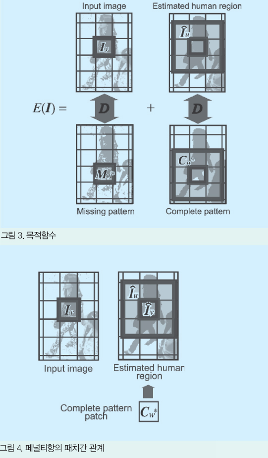 °üÃø È»ó°ú ¹è°æ È»óÀÇ Â÷ºÐ¿¡ ÀÇÇØ ¾ò¾îÁö´Â 2°ª È»óÀ» Áߺ¹µÇÁö ¾Ê´Â ºí·ÏÀ¸·Î ºÐÇÒÇÑ´Ù. ¿©±â¿¡¼ÀÇ ¹®Á¦´Â °¢ ºí·Ï¿¡ ´ëÇØ ÀÔ·Â È»ó ÆÐÄ¡ÀÇ °á¼ÕÀ» º¸¿ÏÇÏ´Â ¿ÏÀü ÆÐÅÏ ÆÐÄ¡¸¦ ÇÒ´çÇÑ ÃßÁ¤ ¿ÏÀü È»óÀ» »ý¼ºÇÏ´Â °ÍÀÌ´Ù. ÀÌ ¶§ »ý¼ºµÈ ÃßÁ¤ ¿ÏÀü È»óÀ» Æò°¡ÇÏ´Â ¸ñÀûÇÔ¼ö´Â ´ÙÀ½°ú °°ÀÌ Á¤ÀǵȴÙ. ¸ñÀûÇÔ¼öÀÇ Á¦1Ç×Àº µ¥ÀÌÅÍÇ×À¸·Î ÀÔ·Â È»ó ÆÐÄ¡¿Í °á¼Õ ÆÐÅÏ ÆÐÄ¡ÀÇ À¯»çµµ°¡ ´õÇØÁø´Ù. Áï, µ¥ÀÌÅÍÇ×À» ÃÖ¼ÒÈÇÏ´Â °ÍÀº ÀÔ·Â È»ó ÆÐÄ¡ÀÇ °á¼Õ°ú °¡±î¿î °á¼Õ ÆÐÅÏÀ» ã´Â °ÍÀÌ´Ù. Á¦2Ç×Àº ÆòȰÈÇ×À¸·Î ÃßÁ¤ ¿ÏÀü È»ó»óÀÇ ´ë»ó ºí·Ï ±Ù¹æ ÆÐÄ¡¿Í ¿ÏÀü ÆÐÅÏ È»ó»ó ±Ù¹æ ÆÐÄ¡ÀÇ °Å¸®¿¡ µû¶ó °ªÀÌ ´õÇØÁø´Ù. ¿©±â¿¡¼´Â ÃßÁ¤ ¿ÏÀü È»ó»óÀÇ ÀÎÁ¢ÇÑ ºí·Ï ÆÐÅÏÀ¸·ÎºÎÅÍ ºí·ÏÀ¸·Î ÇÒ´çµÉ °¡´É¼ºÀÌ ³ôÀº ¿ÏÀü ÆÐÅÏÀ» ã´Â °ÍÀ» ÀǵµÇÑ´Ù. ÆÐÄ¡°£ÀÇ °ü°è¸¦ ±×¸² 3¿¡ ³ªÅ¸³½´Ù.