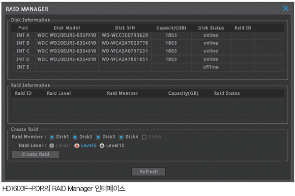 HD1600F-PDRÀº ³»ºÎ¿¡ 5°³±îÁöÀÇ ÇÏµå µð½ºÅ© ÀåÂøÀÌ °¡´ÉÇϸç, À̵é ÇÏµå µð½ºÅ©¸¦ ÀÌ¿ëÇØ ¿Ïº®ÇÑ RAID ±â´ÉÀ» Áö¿øÇÑ´Ù. RAID ·¹º§ 1,5,10ÀÇ ±¸¼ºÀÌ °¡´ÉÇϸç, ÇÏµå µð½ºÅ©ÀÇ ³ìÈÁ¤º¸ ¼Õ»ó½Ã¿¡µµ À̸¦ ½±°Ô º¹±¸ÇÒ ¼ö ÀÖ´Â ±â´ÉÀ» Á¦°øÇØ ³ìÈ µ¥ÀÌÅÍ¿¡ ´ëÇÑ ½Å·Ú¼ºÀ» ÇÑÃþ ³ô¿´´Ù.