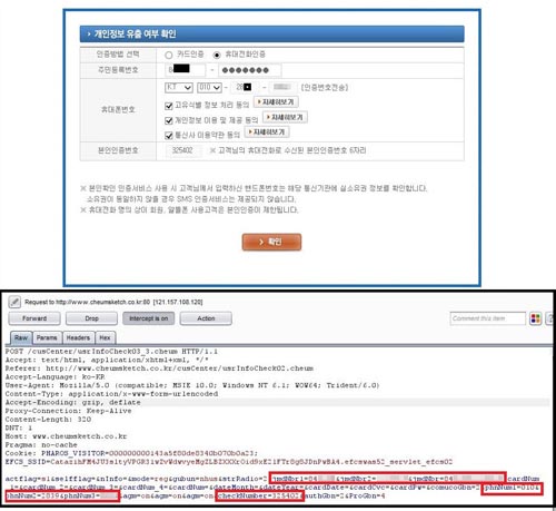 ¡ãNH³óÇùÄ«µå °³ÀÎÁ¤º¸ À¯Ãâ ÆäÀÌÁö¿¡¼ ÀÎÁõÇÒ ¶§ ÀÔ·ÂÇÑ Áֹεî·Ï¹øÈ£, ÈÞ´ëÆù¹øÈ£, º»ÀÎÀÎÁõ¹øÈ£ µîÀÌ ¾ÏȣȸµÇÁö ¾ÊÀº ä ±×´ë·Î ³ëÃâµÈ »óÅ·ΠÀü¼ÛµÇ´Â °ÍÀ» È®ÀÎÇÒ ¼ö ÀÖ´Ù.