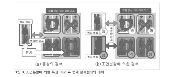 ¿¹¸¦ µé¸é ±×¸² 3(a)¿Í °°ÀÌ Äõ¸® ¿µ»óÀÇ ¹àÀº »óȲ¿¡¼ °üÃøµÈ Àι°¿µ»ó°ú ´Ù¸¥ »ç¶÷ÀÇ ¾îµÎ¿î »óȲ¿¡¼ ÃÔ¿µµÈ Àι°¿µ»ó(±×¸² 3 ¿À¸¥ÂÊ ¾Æ·¡ ·¹Äڵ忡 Æ÷ÇԵŠÀÖ´Â Àι°¿µ»ó)ÀÌ À¯»çÇÒ ¶§ Åë»óÀÇ °Ë»ö¿¡¼´Â ÀÌ Àι°ÀÇ Àι°¿µ»óÀÌ Æ÷ÇԵǴ ·¹Äڵ尡 °Ë»ö »óÀ§°¡ µÅ¹ö¸°´Ù. ÀÌ ¶§ Á¶¸íÁ¶°ÇÀÇ ¸í¾Ïº°·Î Äõ¸® ¿µ»óÀ» ÁغñÇØ ¹àÀº ÃÔ¿µÁ¶°ÇÀÇ Àι°¿µ»óÀº ¹àÀº ÃÔ¿µÁ¶°ÇÀÇ Äõ¸® Ư¡°ú, ¾îµÎ¿î ÃÔ¿µÁ¶°ÇÀÇ Àι°¿µ»óÀº ¾îµÎ¿î ÃÔ¿µÁ¶°ÇÀÇ Äõ¸® Ư¡°ú ºñ±³ÇÏ´Â °ÍÀ¸·Î ±×¸² 3(a)ÀÇ ¿À¸¥ÂÊ ¾Æ·¡ ·¹Äڵ尡 °Ë»ö »óÀ§¿¡ ³ªÅ¸³ªÁö ¾Ê°Ô µÈ´Ù(±×¸² 3(b)).