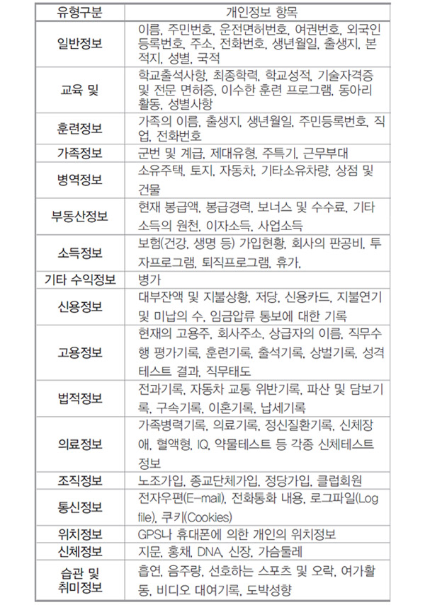 Á¤ºÎ¿¡¼ °øÁöÇÑ °³ÀÎÁ¤º¸ º¸È£ÀÇ ´ë»óÀÌ µÇ´Â ³»¿ëÀ» ºÐ·ùÇÏ¸é ´ÙÀ½°ú °°´Ù.