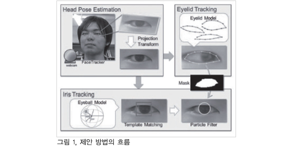 À̹ø ¿¬±¸ÀÇ È帧À» ±×¸² 1¿¡ ³ªÅ¸³½´Ù. ¿ì¼± ÀÔ·Â À̹ÌÁö¿¡ ´ëÇØ¼ ¾ó±¼°ËÃâ ¹× ¾ó±¼ Ư¡ Á¡À» ÃßÀûÇÑ´Ù. ¾ó±¼ Ư¡ Á¡ À§Ä¡¿¡¼ »ç¿ëÀÚÀÇ µÎºÎÀÚ¼¼¸¦ ÃßÁ¤ÇØ ´« ¿µ¿ª À̹ÌÁö¸¦ ÃßÃâÇÑ´Ù. ÀÌ ´« ¿µ¿ª À̹ÌÁö ³»¿¡¼ ´«²¨Ç® ¹× ´«ÀÇ °ËÀºÀÚÀ§¸¦ ÃßÀûÇÑ´Ù. ´«²¨Ç® ÃßÀû¿¡´ÂParticle Filter¸¦ »ç¿ëÇÑ´Ù. À̰ÍÀº °íÂ÷¿ø°ø°£À» ·£´ý »ùÇøµÀ¸·Î È¿À²ÀûÀ¸·Î Ž»öÇÏ¿© »óŸ¦ ÃßÁ¤ÇÏ´Â ¹æ¹ýÀÌ´Ù. »çÀü¿¡ ÇнÀÇÑ ´«²¨Ç® Çü»ó ¸ðµ¨¿¡ ±Ù°ÅÇØ ParticleÀ» »êÆ÷ÇØ ¿¡Áö¿¡ Âø¾ÈÇØ¼ ÃÖÀûÀÎ ´«²¨Ç® Çü»óÀ» ÃßÁ¤Çϰí ÀÖ´Ù. ÀÌ¾î¼ µ¿ÀÏ ´« ¿µ¿ª À̹ÌÁö¿¡ ´ëÇØ¼ ´«ÀÇ °ËÀºÀÚÀ§¸¦ ÃßÀûÇÑ´Ù. ´«ÀÇ °ËÀºÀÚÀ§ ÃßÀû¿¡¼´Â ÅÛÇø´ ¸Åΰú Ÿ¿ø ÇÇÆÃ¿¡ ÀÇÇÑ °íÁ¤¹ÐµµÃßÁ¤À» Á¶ÇÕ½ÃÄÑ È¿À²ÀûÀ¸·Î ÃßÀûÇϰí ÀÖ´Ù.
