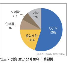 ÇöÀç Àεµ¿¡¼´Â ±â¼úÀÇ ¹ß´Þ·Î ¼ÒºñÀÚµéÀÇ º¸¾È ¿å±¸¸¦ ÃæÁ·½Ãų ¼ö ÀÖ´Â ¾Ë¶÷ º§, ºñµð¿À Æù, ÀÌÁß ±Ý°í, CCTV, µµ¾î·Ï°ú °°Àº ´Ù¾çÇÑ °¡Á¤ º¸¾ÈÁ¦Ç°µéÀÌ Ãâ½ÃµÇ°í ÀÖ´Ù. °¡Á¤¿ë º¸¾ÈÀåºñÀÇ »ç¿ë ºñÀ²Àº CCTVÀÇ ºñÁßÀÌ °¡Àå ³ô¾ÒÀ¸¸ç ÃâÀÔÁ¦ÇÑ, ÀÎÅÍÄÞ µîÀÌ µÚ¸¦ ÀÕ°í ÀÖ´Ù.
