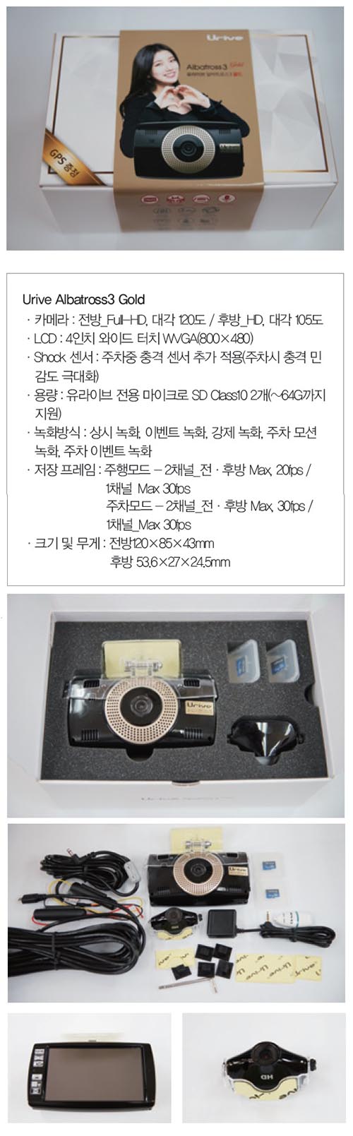 À¯¶óÀ̺êÀÇ ¾Ë¹ÙÆ®·Î½º3 °ñµå´Â 2ä³Î Full-HD ºí·¢¹Ú½º´Ù. Àü¹æ Ä«¸Þ¶ó´Â 1920¡¿1080ÀÇ Full HD°í, ÈĹæ Ä«¸Þ¶ó´Â 1280¡¿720ÀÇ HDÀ̸ç, 4ÀÎÄ¡ ¿ÍÀ̵å ÅÍÄ¡ LCD¸¦ ÀåÂøÇß´Ù. ¼¼·ÃµÈ À¯±¤ ºí·¢ Ä÷¯¿¡ ·»Áî ÁÖº¯°ú À¯¶óÀ̺ê(Urive) ·Î°í¸¸ °ñµå Ä÷¯·Î Æ÷ÀÎÆ®¸¦ Áà °í±Þ½º·´´Ù. 4ÀÎÄ¡ LCD°¡ ´Þ·Á¼ ÀÎÁö Å©±â°¡ ²Ï Å« ÆíÀ¸·Î º»Ã¼°¡ 120¡¿85¡¿43mmÀ̸ç, ÈĹæ Ä«¸Þ¶ó´Â 53.6¡¿27¡¿24.5mm´Ù. ±¸¼ºÇ°¿¡ Æ÷ÇÔµÈ ¸¶ÀÌÅ©·Î SD Ä«µå´Â ¸ðµÎ Ŭ·¡½º 10ÀÇ 16G¿Í 8G µÎ °¡Áö´Ù. ÄÄÇ»ÅÍ¿¡ ½±°Ô ¿¬°áÇÒ ¼ö ÀÖ´Â Ä«µå ¸®´õµµ ¼¾½º ÀÖ°Ô Æ÷ÇԵǾî ÀÖ´Ù.