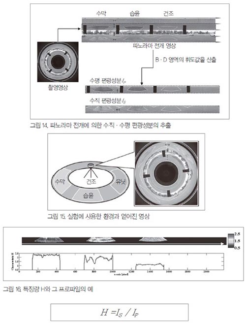¿ì¿¡´Ù1)¡3) ¾¾ µîÀÌ ¿¬±¸ÇÑ ³ë¸éÀÇ ¹Ý»ç±¤¿¡¼ º¼ ¼ö ÀÖ´Â Æí±¤ Ư¼ºÀ» ÀÌ¿ëÇØ ¼ö¸·Çö»ó(Hydroplaning)ÀÇ ¿øÀÎÀÌ µÉ ¼ö ÀÖ´Â ³ë¸éÀÇ ½ÀÀ±»óȲÀ» °ËÃâÇÏ´Â ¹æ¹ý ¿ª½Ã ±× Áß Çϳª¶ó°í º¼ ¼ö ÀÖ´Ù. ÀÚ¿¬±¤À» ±¤¿øÀ¸·Î ³ë¸éÀÇ ¼öÁ÷¡¤¼öÆò Æí±¤ ¿µ»óÀ» ÃÔ¿µÇÏ°í ±×°ÍµéÀÇ ÈÖµµ °ªÀÎ ¼öÁ÷¡¤¼öÆò Æí±¤¼ººÐÀ» ºñ±³ÇØ ³ë¸é»óŸ¦ ÀνÄÇÑ´Ù.