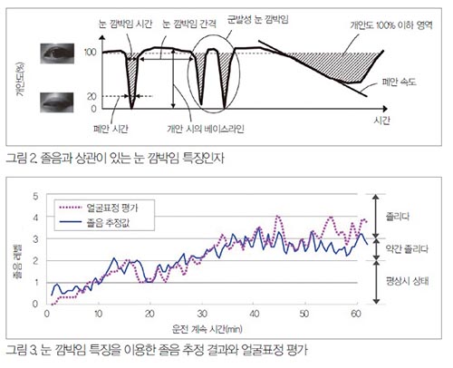 ´« ±ô¹ÚÀÓÀ» Á¤È®ÇÏ°Ô °èÃøÇÏ´Â ¹æ¹ýÀ¸·Î¼´Â EOG°¡ Àִµ¥, ÀÌ ¹æ¹ýÀº ´«²¨Ç®¿¡ Àü±ØÀ» ºÙÀÏ Çʿ䰡 ÀÖ¾î ¿îÀüÀÚ¿¡°Ô ¹ø°Å·Ó±â ¶§¹®¿¡ Çö½ÇÀûÀÌÁö ¾Ê´Ù. ¸ö¿¡ Âø¿ëÇÒ ¼ö Àִ ŸÀÔÀÇ ´« ÀüÀ§ ¼¾¼µµ °³¹ßµÇ°í ÀÖÀ¸³ª8) ¾ÈÁ¤ÀûÀ¸·Î ÇǺο¡ Á¢Ã˽Ã۱â À§Çؼ´Â ¾ÆÁ÷ °úÁ¦°¡ ÀÖ´Ù. ±×·¡¼ Ä«¸Þ¶ó¿¡ ÀÇÇØ ¿îÀüÀÚÀÇ ¾ó±¼ À̹ÌÁö¸¦ ÃÔ¿µÇϰí À̹ÌÁö ÀÎ½Ä ±â¼ú¿¡ ÀÇÇØ Á¹À½°ú »ó°üÀÌ ÀÖ´Â ¹°¸®ÀûÀÎ ¾çÀ» °ËÃâÇÏ¿© Á¹À½»óŸ¦ ÃßÁ¤ÇÏ´Â µå¶óÀ̹ö ¸ð´ÏÅͰ¡ °³¹ßµÇ°í ÀÖ´Ù. ÀÌ ¹æ¹ýÀº ºñÁ¢ÃË¡¤ºñ±¸¼ÓÀ̱⠶§¹®¿¡ ¿îÀüÀÚ¿¡°Ô ºÎÇϸ¦ ÁÖÁö ¾Ê´Â ÀÌÁ¡ÀÌ ÀÖÁö¸¸ °³ÀÎÂ÷³ª Âø¿ë¹°, ½Ã½Ã°¢°¢ º¯ÈµÇ´Â ºûȯ°æÀ̳ª ÀÚ¼¼º¯ÈÀÇ ¿µÇâ¿¡ ÀÇÇØ ¾ÈÁ¤ÀûÀ¸·Î ÀÎ½Ä Ã³¸®ÇϱⰡ ¾î·Æ´Ù.