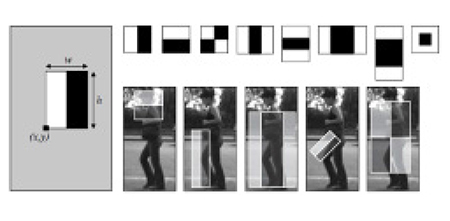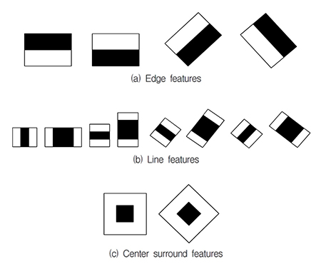 ¿µ»ó±â¹Ý °´Ã¼ °ËÃâÀ» À§ÇÑ Æ¯Â¡Á¡ ¼±ÅÃÀº °´Ã¼ °ËÃâ ¼º´É¿¡ ¸¹Àº ¿µÇâÀ» ÁØ´Ù. ±×¸² 1Àº ±âº»Çü À¯»ç Haar Ư¡Á¡À» ³ªÅ¸³½ °ÍÀÌ´Ù. (a), (b), (c)´Â °¢°¢ °æ°è¼± Ư¡Á¡, ¼± Ư¡Á¡, Áß½É Æ¯Â¡Á¡ÀÌ´Ù. ±×¸² 2´Â À¯»ç Haar Ư¡Á¡À» Ȱ¿ëÇØ °´Ã¼¸¦ °ËÃâÇÏ´Â ¿ø¸®¸¦ ³ªÅ¸³½ °ÍÀ¸·Î º¸ÇàÀÚÀÇ °¢ ¿òÁ÷ÀÓ¿¡ ´ëÇØ À¯»çµµ°¡ ³ôÀº Ư¡Á¡À» ³ªÅ¸³½ °ÍÀÌ´Ù.