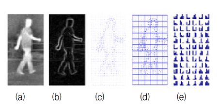 ±×¸² 3Àº HOG Ư¡Á¡À» ¾ò´Â °úÁ¤À» ³ªÅ¸³½ °ÍÀÌ´Ù. (a)´Â ¾ß°£¿¡ ÃÔ¿µµÈ º¸ÇàÀÚ ¿µ»óÀ̸ç, (b)´Â ±â¿ï±â¸¦ °ËÃâÇÑ °á°úÀ̰í, (c)´Â ±â¿ï±â ¹æÇâÀ» Ç¥½ÃÇÑ °ÍÀÌ´Ù. (d)´Â º¸ÇàÀÚ ¿µ»óÀ» ÀÏÁ¤ÇÑ °£°ÝÀ¸·Î ¿µ¿ªÀ» ¼³Á¤ÇÑ °ÍÀ̸ç, (e)´Â °¢ ¿µ¿ª¿¡ ´ëÇÑ ±â¿ï±â ¹æÇâÀÇ È÷½ºÅä±×·¥À» ³ªÅ¸³½ °ÍÀÌ´Ù. º¸ÇàÀÚ¿¡ ´ëÇÑ ±â¿ï±â ¹æÇâ È÷½ºÅä±×·¥Àº HOG Ư¡À» ºñ±³ÇØ º¸ÇàÀÚ¸¦ °ËÃâÇϴµ¥ Ȱ¿ëÇÑ´Ù. ÀϹÝÀûÀ¸·Î º¸ÇàÀÚ °ËÃâ¿¡ È¿°úÀûÀΠƯ¡Á¡À¸·Î ¾Ë·ÁÁ® ÀÖ´Ù.