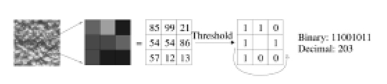 ±×¸² 4´Â LBP Ư¡Á¡À» ±¸ÇÏ´Â °úÁ¤À» ³ªÅ¸³½ °ÍÀÌ´Ù. ƯÁ¤ ¿µ¿ª¿¡¼ Áß½É È¼Ò¸¦ ±âÁØÀ¸·Î ¹à±â°ªÀÌ Å« ȼҴ 1·Î, ÀÛÀº ȼҴ 0À¸·Î ¼³Á¤ÇØ ¹Ý½Ã°è ¹æÇâÀ¸·Î »ý¼ºµÈ ºñÆ® ÆÐÅÏÀ» Ư¡Á¡À¸·Î Ȱ¿ëÇÑ´Ù.