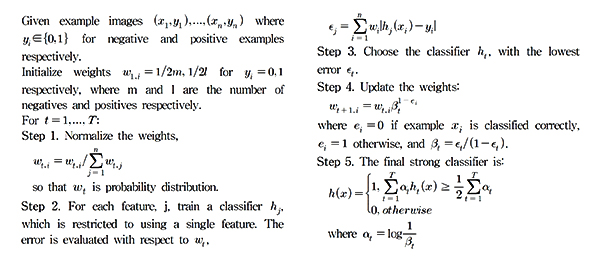 °´Ã¼ÀÇ Çü»ó º¯È°¡ Àְųª °ãħÀ̳ª ÀâÀ½ÀÌ ÀÖ´Â »óȲ¿¡¼´Â ÇнÀ ¾Ë°í¸®ÁòÀ» ÀÌ¿ëÇÑ °´Ã¼¸¦ °ËÃâ ¹æ¹ýÀÌ Á¦¾ÈµÇ°í ÀÖ´Ù. Ç¥ 1Àº º¸ÇàÀÚ¿Í ¾ó±¼ °ËÃâ¿¡ Ȱ¿ëµÇ°í ÀÖ´Â Adaboost ¾Ë°í¸®ÁòÀÌ´Ù. 3´Ü°è¿¡¼ ±¸ÇÑ ¾àºÐ·ù±âµéÀ» Á¶ÇÕÇØ 4´Ü°è¿¡¼´Â °ºÐ·ù±â¸¦ Çü¼ºÇØ Æ¯Á¤ ¿µ¿ª¿¡ ´ëÇÑ À¯»ç Haar Ư¡Á¡À̳ª HOG Ư¡Á¡À» ºñ±³ÇØ º¸ÇàÀÚ¸¦ °ËÃâÇÑ´Ù.