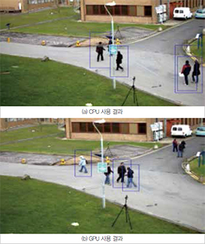 ±×¸² 5¿Í 6Àº °¢°¢ À¯»ç Haar Ư¡Á¡À» ÀÌ¿ëÇÑ Adaboost ¾Ë°í¸®Áò°ú HoG Ư¡Á¡À» ÀÌ¿ëÇÑ SVM ¾Ë°í¸®Áò¿¡ ´ëÇØ CPU¿Í GPU¿¡¼ °ËÃâÇÑ °á°ú´Ù. °¢ ¾Ë°í¸®ÁòÀ» CPU³ª GPU·Î ±¸ÇöÇØ º¸ÇàÀÚ¸¦ °ËÃâÇÏ´Ï, ´ëü·Î Àß °ËÃâÇÏ´Â °ÍÀ» È®ÀÎÇÒ ¼ö ÀÖ´Ù.