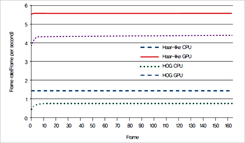 ±×¸² 7Àº À¯»ç Haar Ư¡Á¡À» Ȱ¿ëÇÑ Adaboost ¾Ë°í¸®Áò°ú HOG Ư¡À» Ȱ¿ëÇÑ SVM ¾Ë°í¸®ÁòÀ» CPU¿Í GPU¿¡ Àû¿ëÇØ °ËÃâ ó¸® ¼Óµµ¸¦ ºñ±³ÇÑ °ÍÀÌ´Ù. ±ä Á¡¼±°ú ½Ç¼±Àº À¯»ç Haar Ư¡Á¡Àº CPU¿Í GPU¸¦ Ȱ¿ëÇØ °ËÃâ ó¸® ¼Óµµ¸¦ ³ªÅ¸³»°í, ÀÏÁ¡ ¼â¼±°ú ªÀº Á¡¼±Àº HOG Ư¡Á¡¿¡ ´ëÇØ CPU¿Í GPU·Î ó¸®ÇÏ´Â ¼Óµµ¸¦ ³ªÅ¸³½´Ù.
