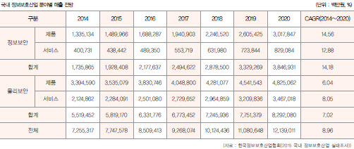 ºÐ¾ßº°·Î´Â Á¤º¸º¸¾ÈÀÇ °æ¿ì Á¤º¸º¸¾È Á¦Ç° ºÐ¾ß ¸ÅÃâÀÌ 2014³â 1Á¶ 3,351¾ï 3,400¸¸¿ø¿¡¼ ¿¬Æò±Õ 14.56%¾¿ ¼ºÀåÇØ 2020³â¿¡´Â 3Á¶ 178¾ï 4,700¸¸¿ø ±Ô¸ð¿¡ ´ÞÇÒ °ÍÀ¸·Î ÃßÃøµÈ´Ù. Á¤º¸º¸¾È ¼ºñ½º ºÐ¾ß ¸ÅÃâÀº 2014³â 4,007¾ï 3,100¸¸¿ø¿¡¼ 2020³â 8,290¾ï 6,400¸¸¿øÀ¸·Î ¿¬Æò±Õ 12.88% ¼ºÀåÇÒ °ÍÀ¸·Î ¿¹»óµÈ´Ù. ¹°¸®º¸¾ÈÀÇ °æ¿ì ¹°¸®º¸¾È Á¦Ç° ºÐ¾ß ¸ÅÃâÀÌ 2014³â 3Á¶ 3,945¾ï 5,000¸¸¿ø¿¡¼ 2020³â 4Á¶ 8,250¾ï 6,200¸¸¿øÀ¸·Î ¿¬Æò±Õ 6.04%ÀÇ ¼ºÀå·üÀ» ±â·ÏÇÒ °ÍÀ¸·Î ºÐ¼®µÇ¸ç, ¹°¸®º¸¾È ¼ºñ½º ºÐ¾ß ¸ÅÃâÀº 2014³â 2Á¶ 1,248¾ï 6,200¸¸¿ø¿¡¼ 2020³â 3Á¶ 4,670¾ï 1,800¸¸¿øÀ¸·Î ¿¬Æò±Õ 8.5% Áõ°¡ÇÒ °ÍÀ̶ó´Â Àü¸ÁÀÌ´Ù.